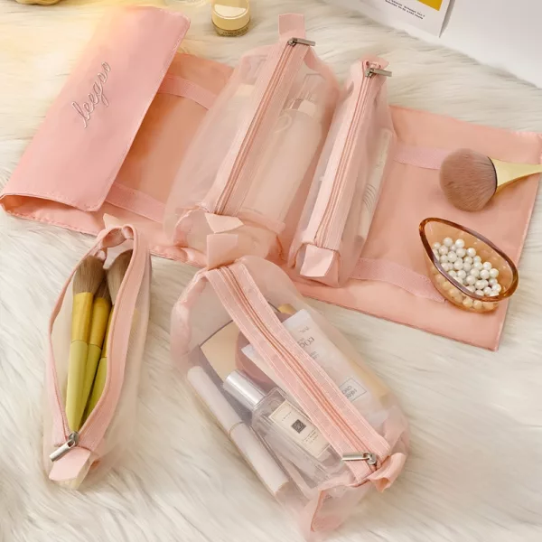 Dieser faltbare Make-up-Beutel kann an Türen, Handtuchstangen oder Haken befestigt werden. Dies macht den Inhalt leicht sichtbar und zugänglich und spart Platz auf der Theke.