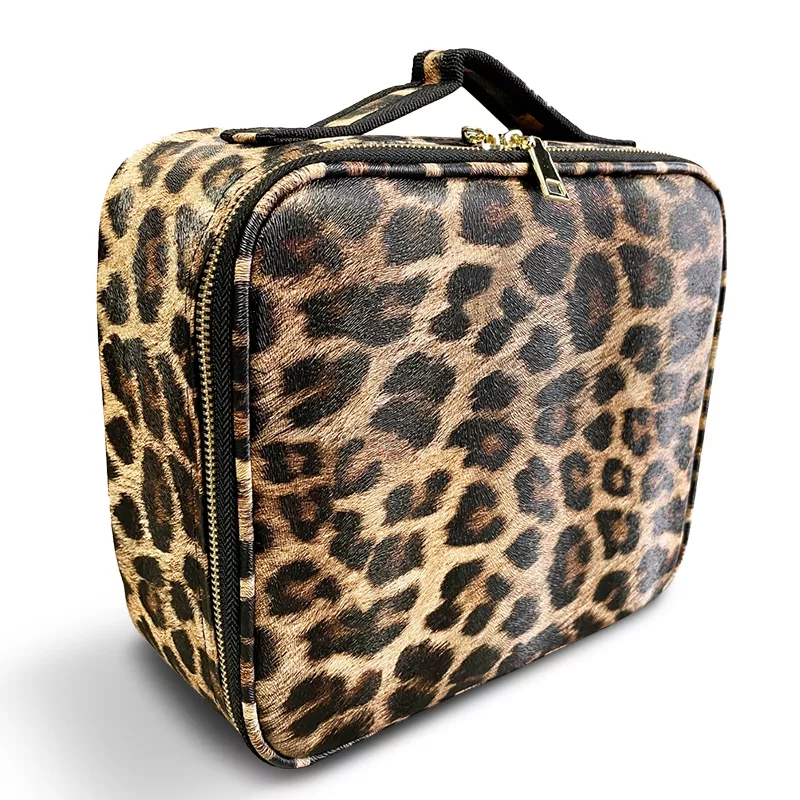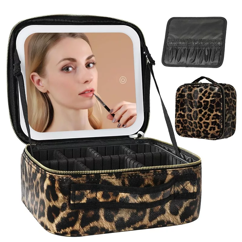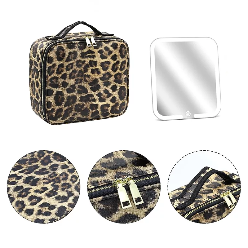 Leopard Make-up-Organizer-Tasche, beleuchtete Kosmetikhülle mit Spiegel