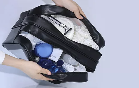 Unsere Kulturtasche verfügt über zwei Fächer, die Ihre Kosmetika ordentlich und organisiert halten. Sie trennt feuchte Gegenstände von Ihrem Make-up, um Feuchtigkeitsschäden zu vermeiden.